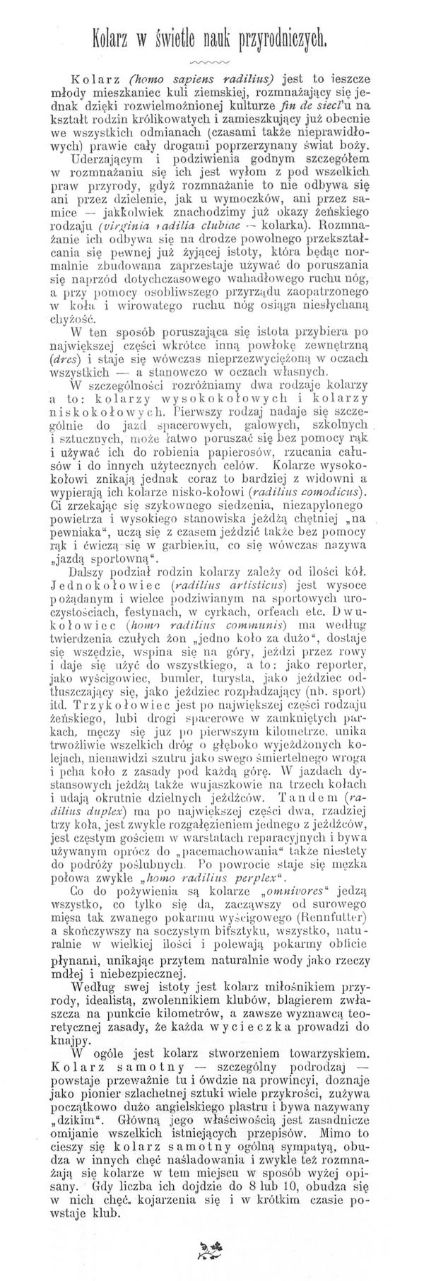 To chyba najstarszy, a na pewno jeden z najstarszych tekstów dotyczących kolarzy. Jest tak stary, że nie występuje w nim nieznane wówczas słowo ROWER. W tamtych czasach jeżdżono na KOLE, i konsekwentnie nie było rowerzystów lecz kolarze. Tekst charakteryzuje się wysmakowanym dowcipem, na poziomie do którego dziś nikt się nawet nie zbliży...